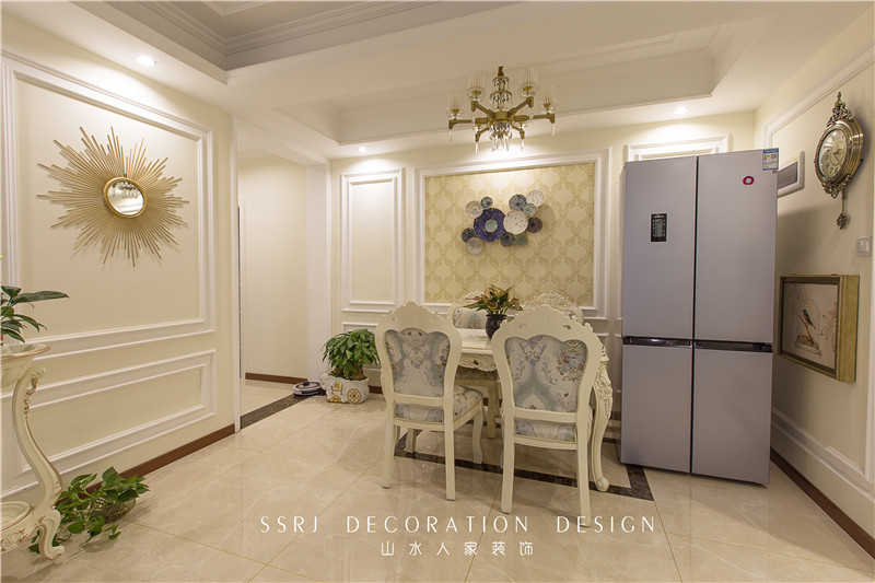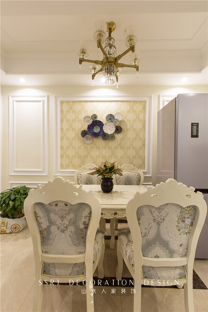 餐廳與客廳相連,將優(yōu)雅的氣質延伸至餐桌上,雅致的淡黃墻紙搭配上簡約的石膏線條,墻飾是設計師苦苦挑選良久后的選擇,深淺不一的藍與金邊的契合度完美的讓人驚喜,地面通過波打線的區(qū)域劃分,加上波打線內磚斜鋪,外磚正鋪,將地面的層次劃分也是展現(xiàn)的淋漓盡致,空間與時間的交錯在這里閃耀著明亮的光。
