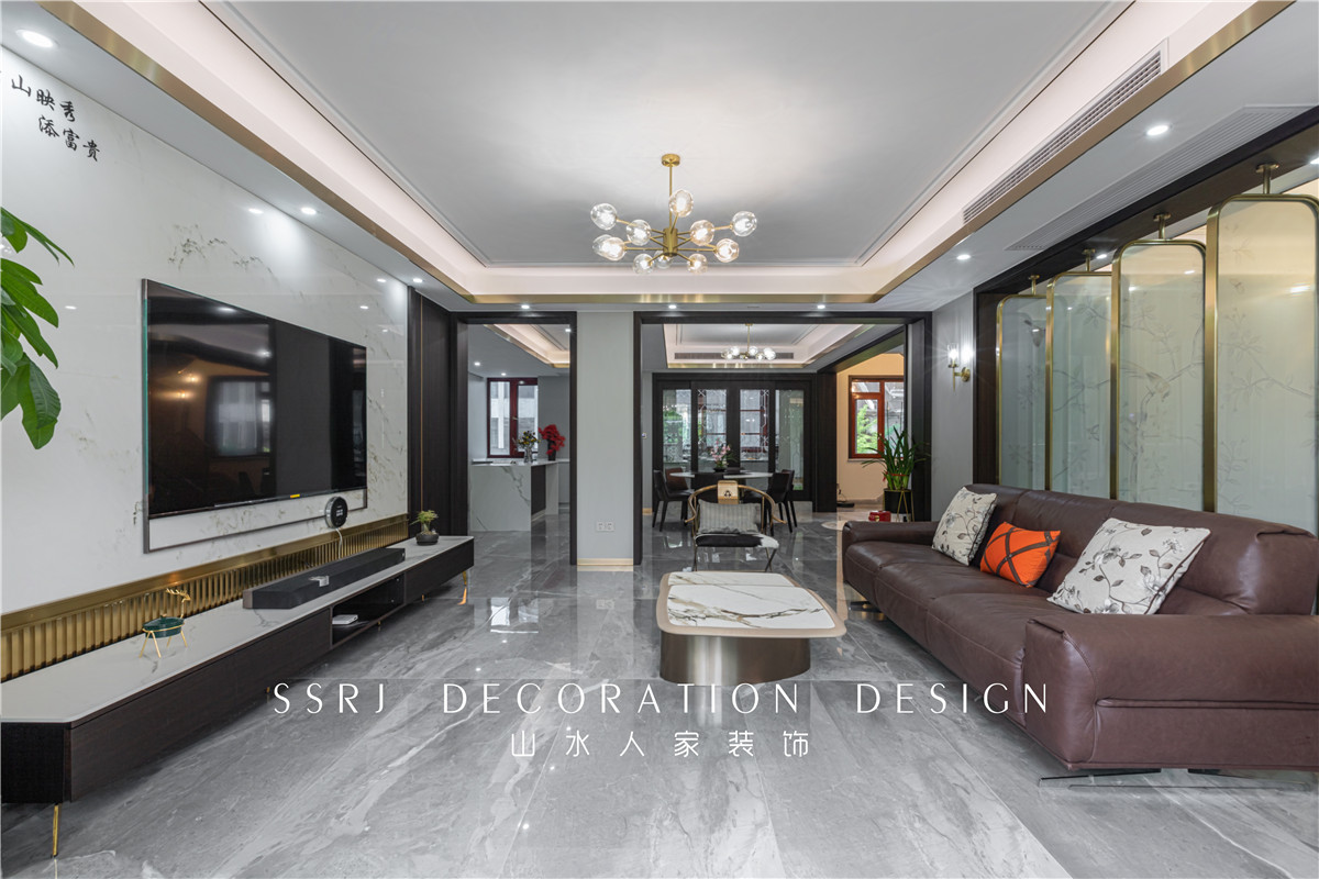 背景墻應(yīng)用的是大理石背景板,上面的花紋細(xì)膩柔和,凸顯“云山映秀添富貴”的氣質(zhì),四周有著金屬線條和木板的點(diǎn)綴,增加美觀度。