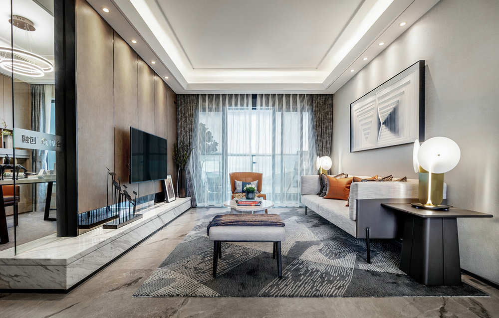 客廳整潔不凌亂,頂部用工字收口條,打造極窄懸浮的無主燈吊頂。同時(shí)預(yù)埋磁吸軌道,線條感十足。地面通鋪800*800暖色地磚,平添幾分溫暖意味。