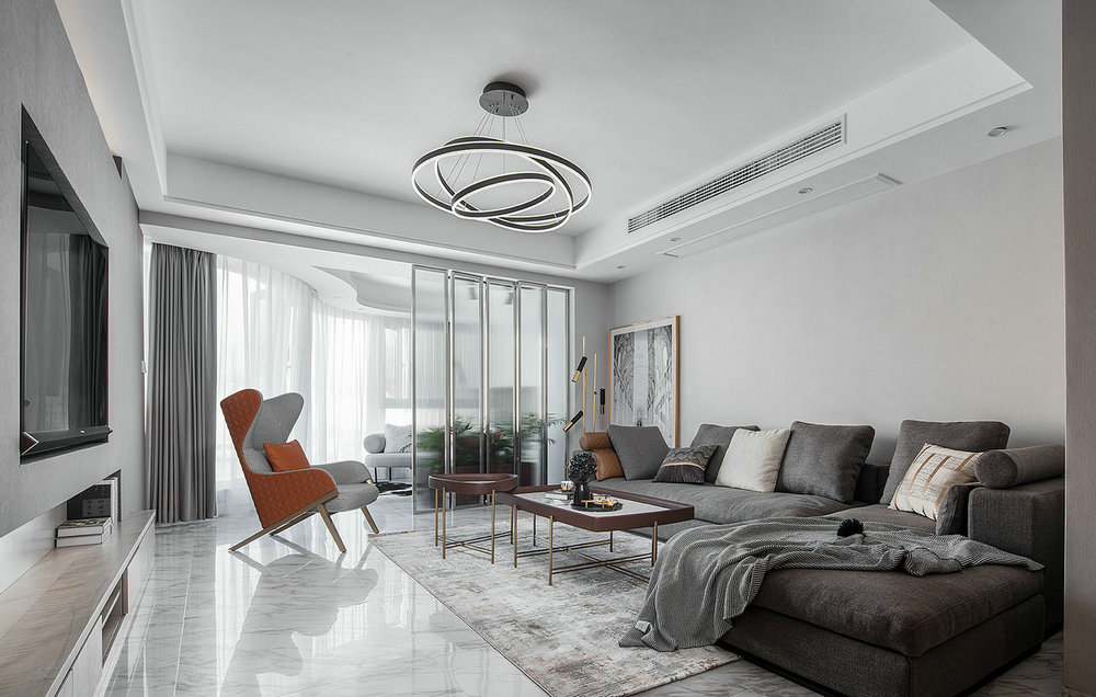 客廳大面積留白+干凈線條,凸顯簡約高級的氣質。無主燈設計,實現全屋無死角照明,效果格外顯著。地面通鋪拋光磚,光感甚佳,再鋪一層黑白色地毯,更添生活情調。