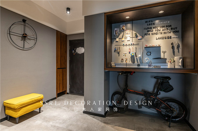 側(cè)面定制了一組到頂衣柜,整體用到灰色柜板,使臥室充滿了時尚活力的感覺。臥室進門位置同樣打造柜體,化整為零,滿足更多收納實需。