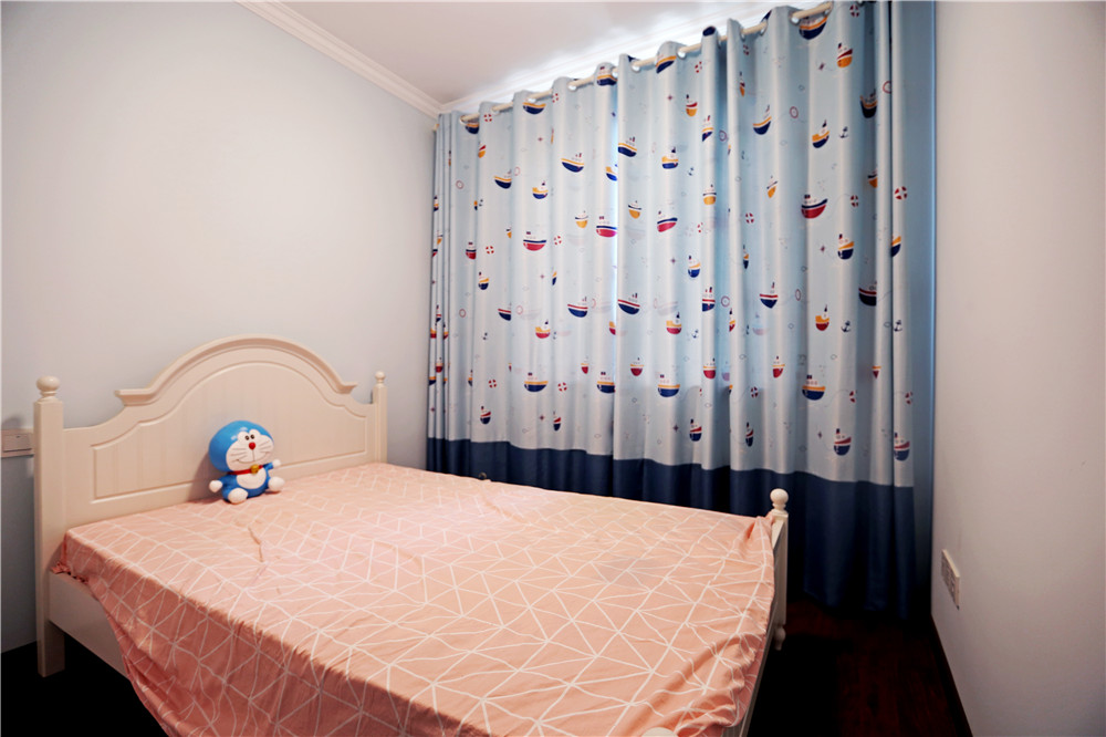 兒童房是留給還沒(méi)出生的小寶寶用的,藍(lán)色碎花窗簾和木質(zhì)床具活潑又不失溫馨。