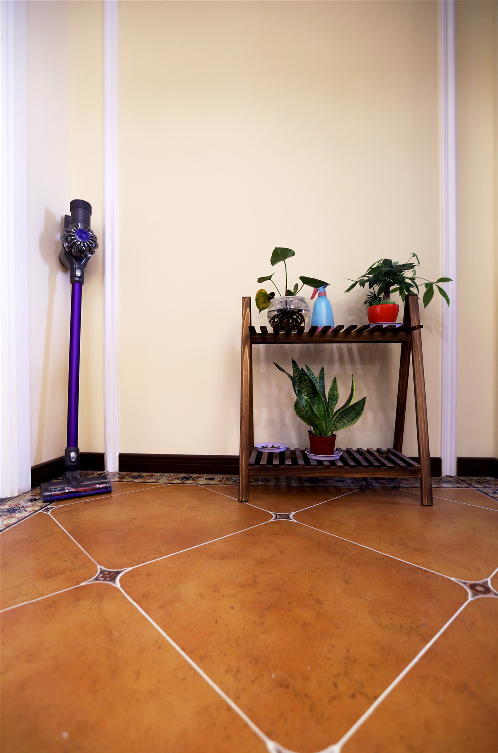 褐色仿古磚,讓你一進(jìn)門(mén)就享受到“回歸”的感覺(jué)。左側(cè)的鞋柜客串了鞋凳的身份,與衣柜收納三位一體。