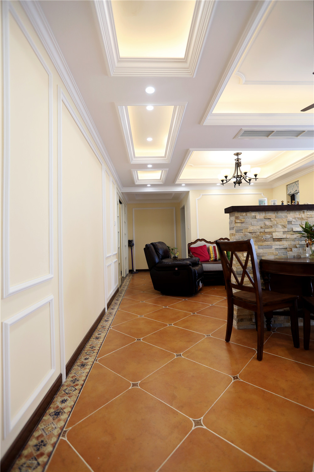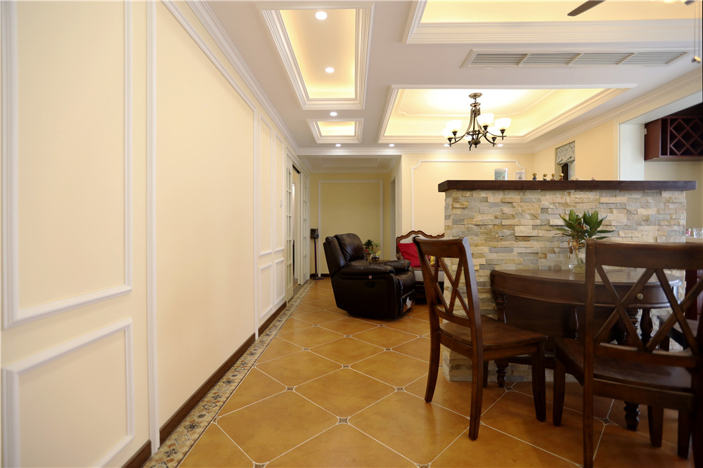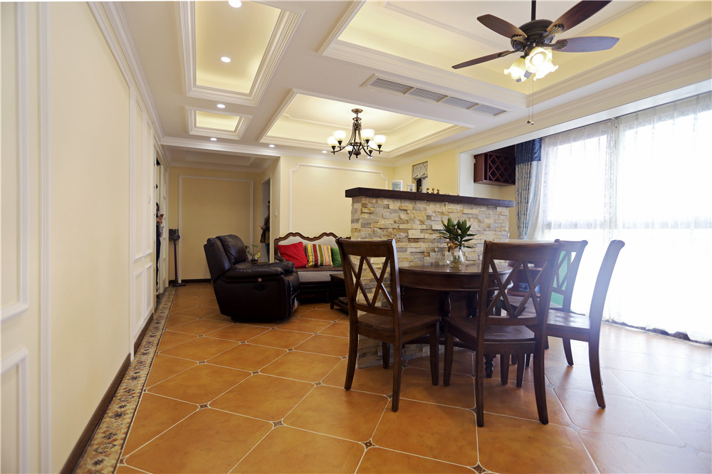 三五好友相聚,背倚“吧臺(tái)”,一邊吃著從廚房端上來(lái)的水果零食,一邊聊著過(guò)往。頭上的吊扇燈,一物兩用,讓古典和現(xiàn)代完美融合。