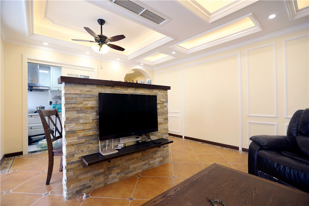 有人的地方就有江湖,有客廳的地方就有電視。“吧臺(tái)”背面的真相其實(shí)是電視墻,此處的設(shè)計(jì)十分精巧。一邊聽(tīng)著電視里的音樂(lè),廚房的香氣漸漸傳來(lái),客人的臉上滿是笑顏。